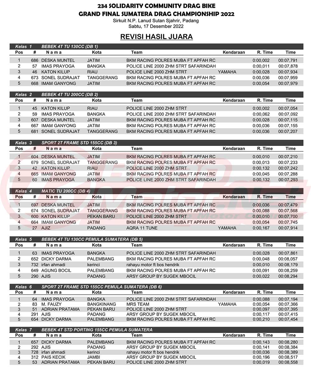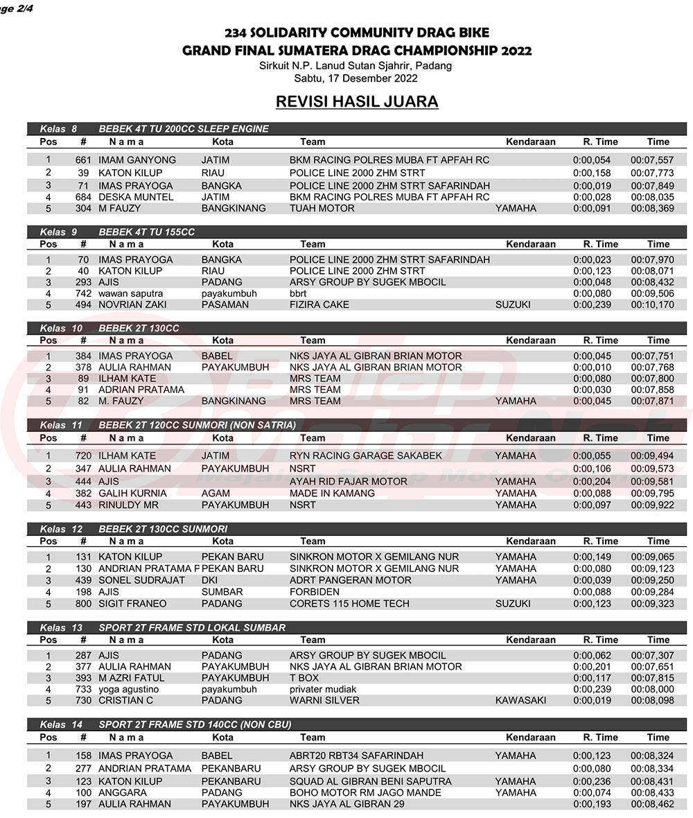 BalapMotor.Net – Gelaran 234 Solidarity Community Drag Bike Grand Final Sumatera Drag Championship (SDC) 2022 mampu pecah telor dalam jumlah starter yang ikut serta. Event ini berhasil menyedot total 815 starter.