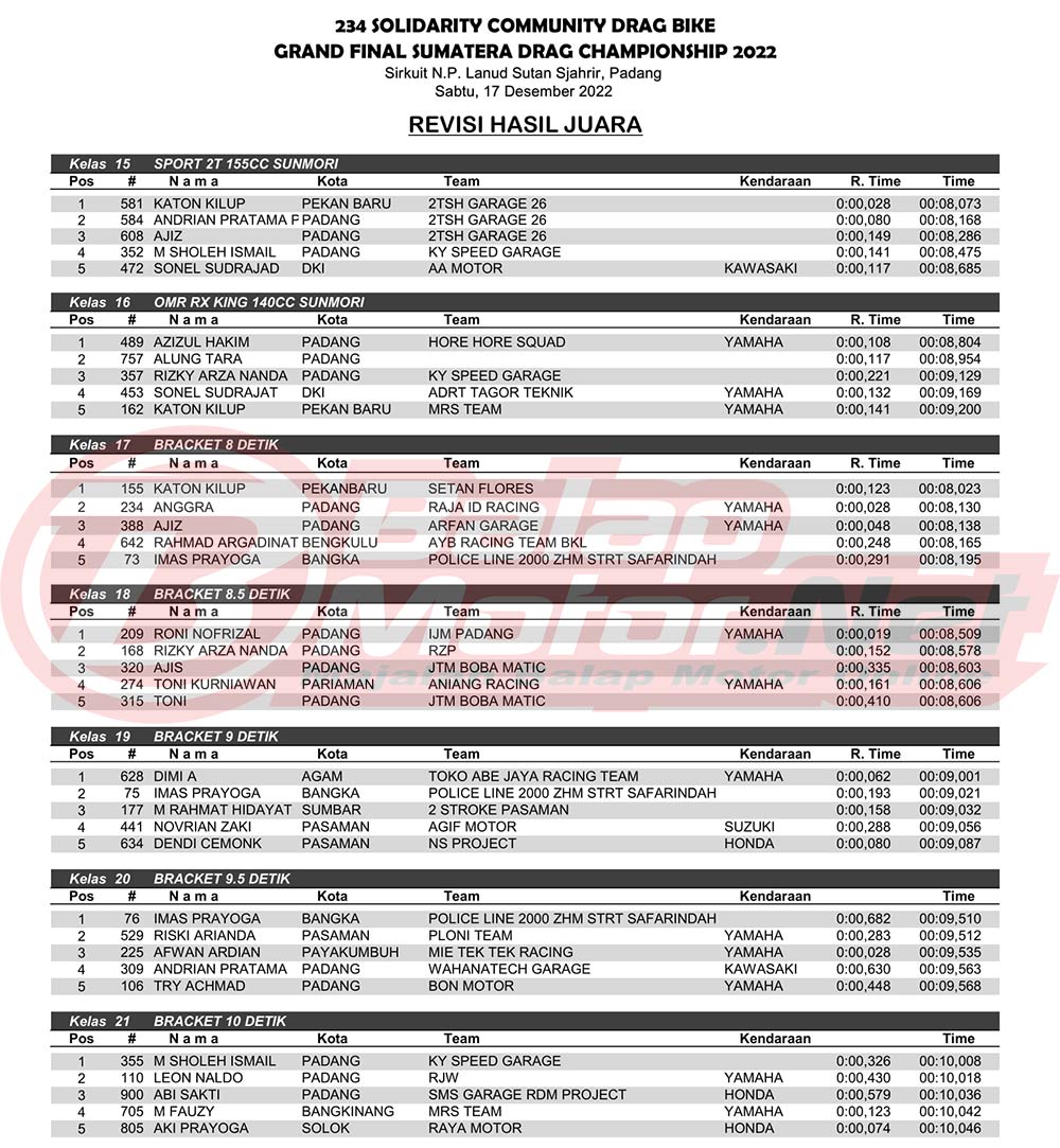 Dari total 23 kelas yang dilombakan, kelas bracket 10 detik menjadi kelas dengan jumlah starter terbanyak dalam event yang digelar di sirkuit NP Lanud Sultan Sjahrir, Kota Padang, Sumatera Barat yaitu 121 starter.