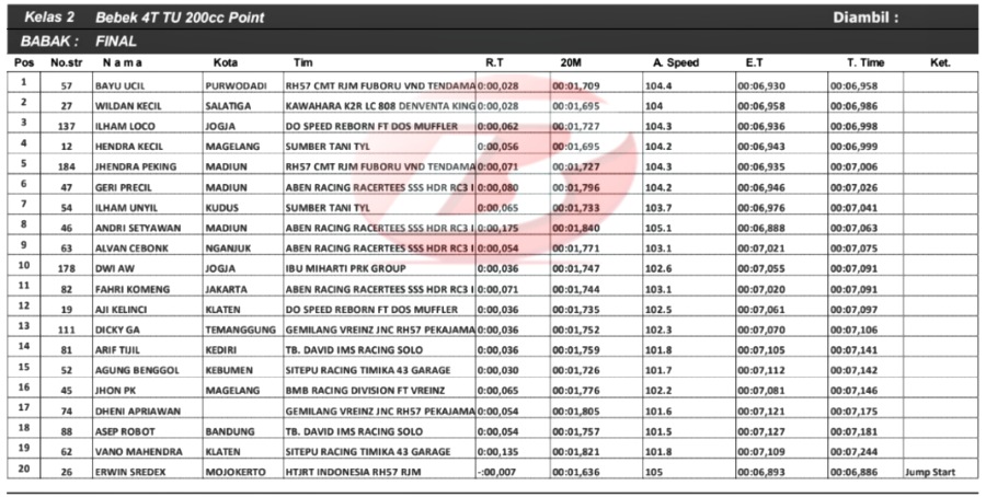 Juragan apparel RH57 tersebut mencatat waktu fantastis 7,1 detik dengan matic racikan ASR Bandung. Tapi tak sampai disitu saja. Penampilan menawan Bayu Ucil juga berlanjut pada kelas bebek 4T TU 200cc.