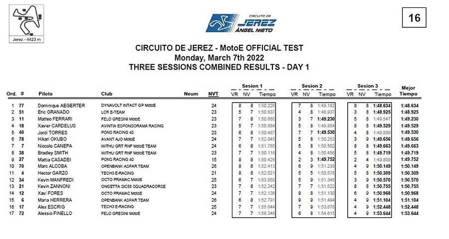Pembalap asal Swiss yang mengikuti dua kejuaraan dunia itu mencatat lap terbaik di sesi ketiga. Pada awal tes Bradley Smith langsung jadi yang teratas. Kemudian sesi kedua menjadi milik Eric Granado sebelum di sesi terakhir Dominique Aegerter mempertajam waktunya.