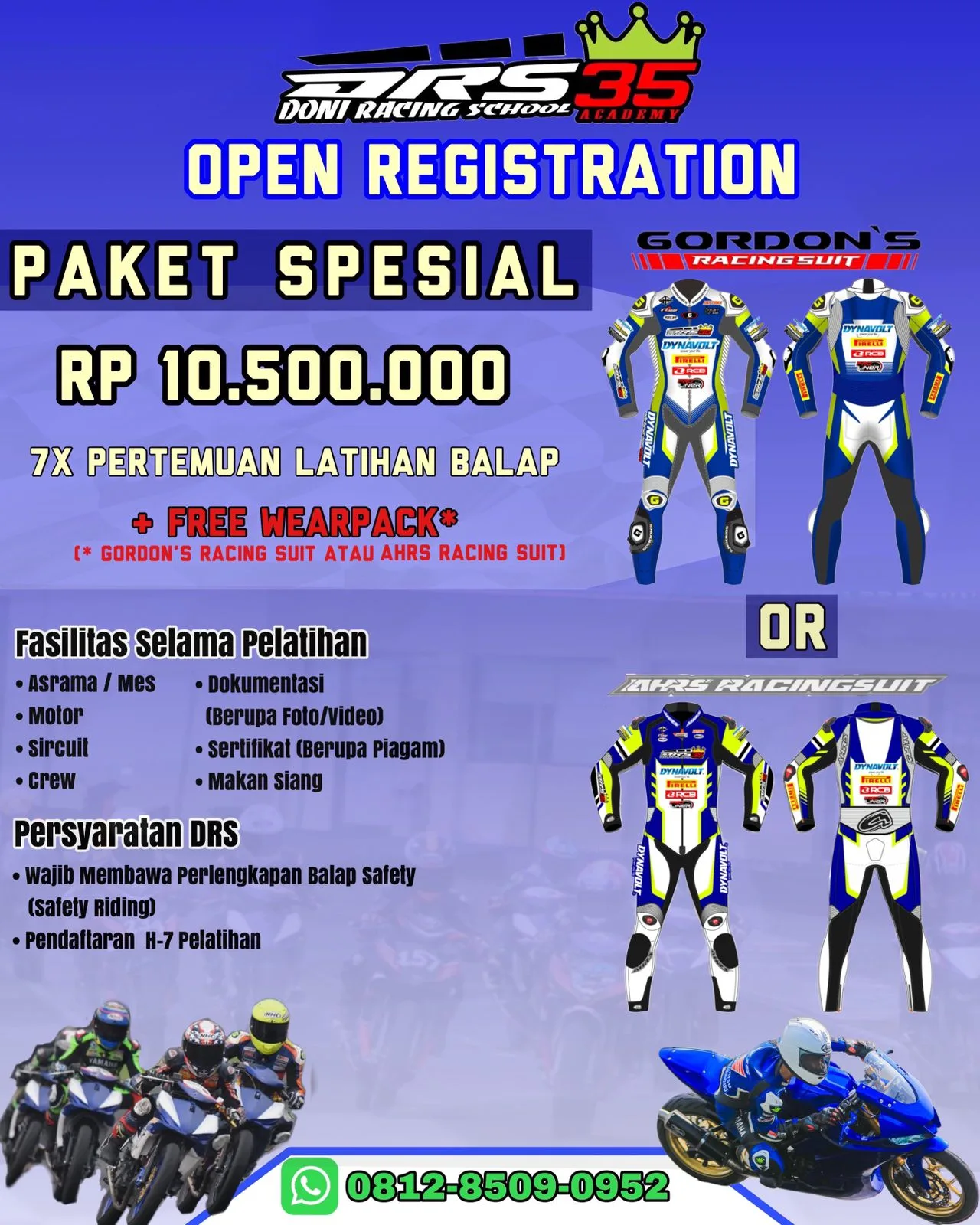 BalapMotor.Net – Pada penghujung tahun ini, sekolah balap Doni Racing School (DRS 35) membuka paket spesial gaes. Jadi bagi peserta yang mengikuti paket tersebut maka akan mendapatkan bonus wearpack atau baju balap gratis dari brand Gordons atau AHRS.
