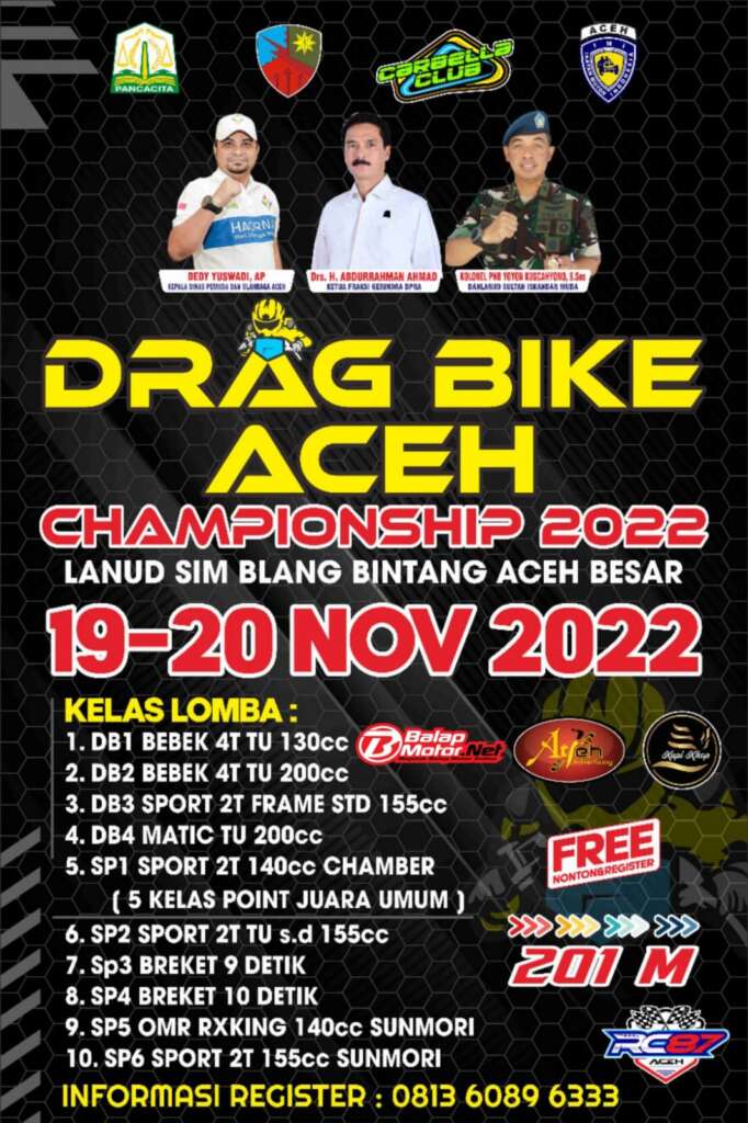 Rangkaian kegiatan balap Drag Bike Aceh garapan Carbella Club kali ini bakal kolaborasi dengan RC 87 yang nanti nya free registrasi untuk peserta. Selain itu, untuk penonton juga bakalan gratis.