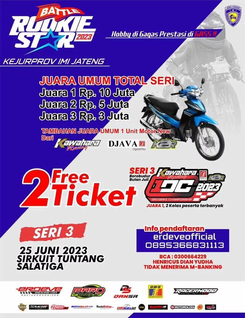 BalapMotor.Net – Kejurprov IMI Jateng Drag Bike Rookie Star Battle putaran ketiga akan berlangsung di sirkuit Tuntang, Salatiga akhir pekan ini (25 Juni 2023).