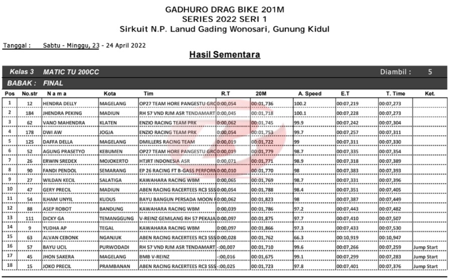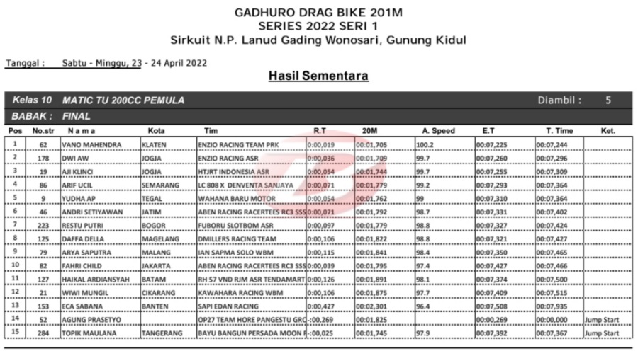 Sementara di kelas pemula Vano Mahendra yang membawa spek matic injeksi sukses jadi yang teratas. Dengan hasil ini, tentu saja pacuan ASR baik spek karbu maupun injeksi sama mantapnya.