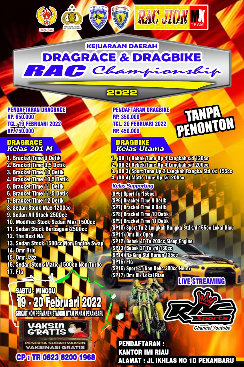 BalapMotor.Net – Kejuaraan Daerah Dragrace & Dragbike RAC Championship bakal digelar akhir pekan ini di sirkuit NP. Stadion Utama Panam, Pekanbaru, Riau (19-20 Februari 2022).