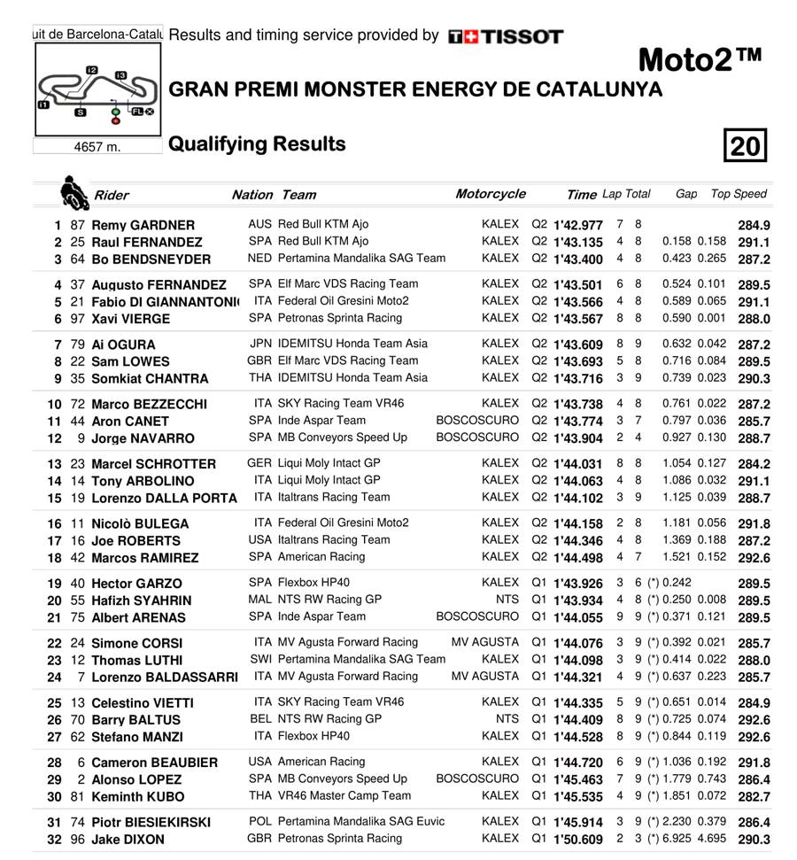 Dua pembalap tersebut adalah Remy Gardner (Red Bull KTM Ajo) dan Bo Bendsneyder (Pertamina Mandalika SAG Team). Kedua pembalap yang memakai helm NHK tipe GP-R Tech ini mampu menduduki posisi pertama dan ketiga pada sesi QTT.