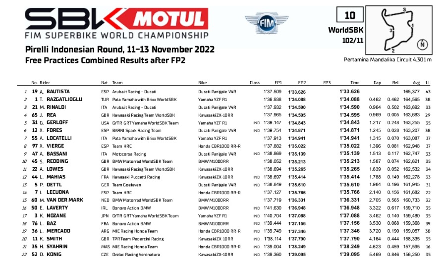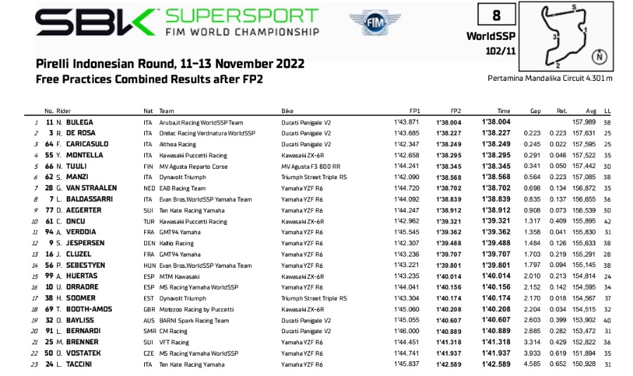 Berikut hasil kombinasi FP1-FP2 WSSP dan WSBK Mandalika:
