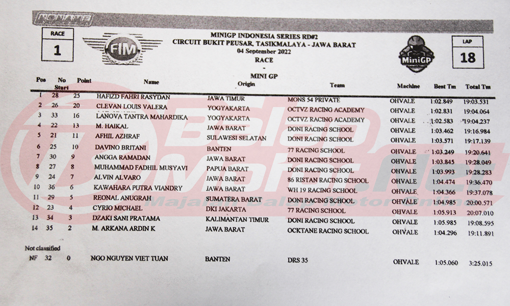 BalapMotor.Net – Pertarungan sengit antara Hafidz Fahril Rasyadan dan Clevan Louis Valera Octavianus terjadi dalam race 1 seri 2 FIM MiniGP Indonesia Series 2022 yang digelar di sirkuit Bukit Peusar Kota Tasikmalaya pada hari Minggu 4 September 2022.