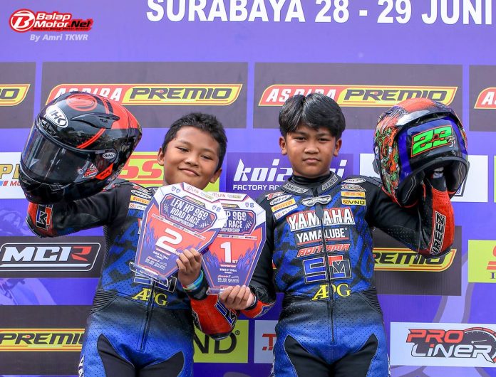 BalapMotor.Net – Duet rider cilik berbakat dari tim Yamaha Yamalube SCM Grup Aditama NHK VND STSJ GDT Berau kembali menunjukkan tajinya di ajang balap nasional. Kali ini, Sabian Fathul Ilmi dan Danadyaksa Wida Pangestu sukses menguasai podium 1-2 di kelas Rookie pada putaran perdana LFN HP969 Road Race Championship 2025 yang digelar di Sirkuit Gelora Bung Tomo, Surabaya, pada 28–29 Juni 2025.