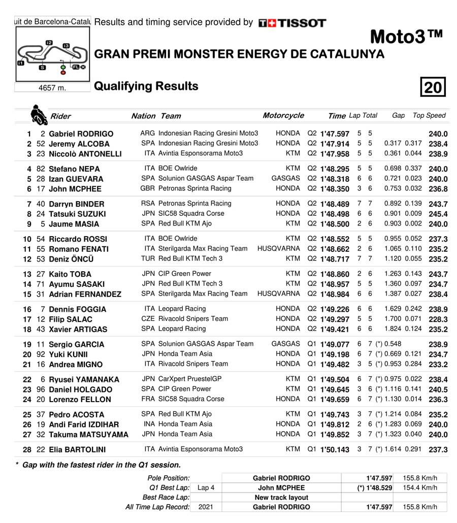 Dengan hasil pada sesi kualifikasi ini, mereka berdua berhak start dari pole position dan posisi kedua pada balapan besok (6/6). Sementara itu, pimpinan klasemen sementara Moto3 yaitu Pedro Acosta (Red Bull KTM Ajo) pada sesi kali ini tampil kurang begitu baik.