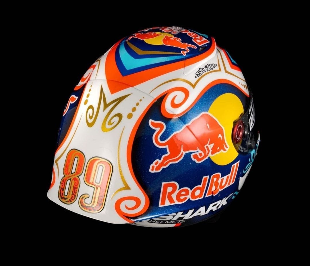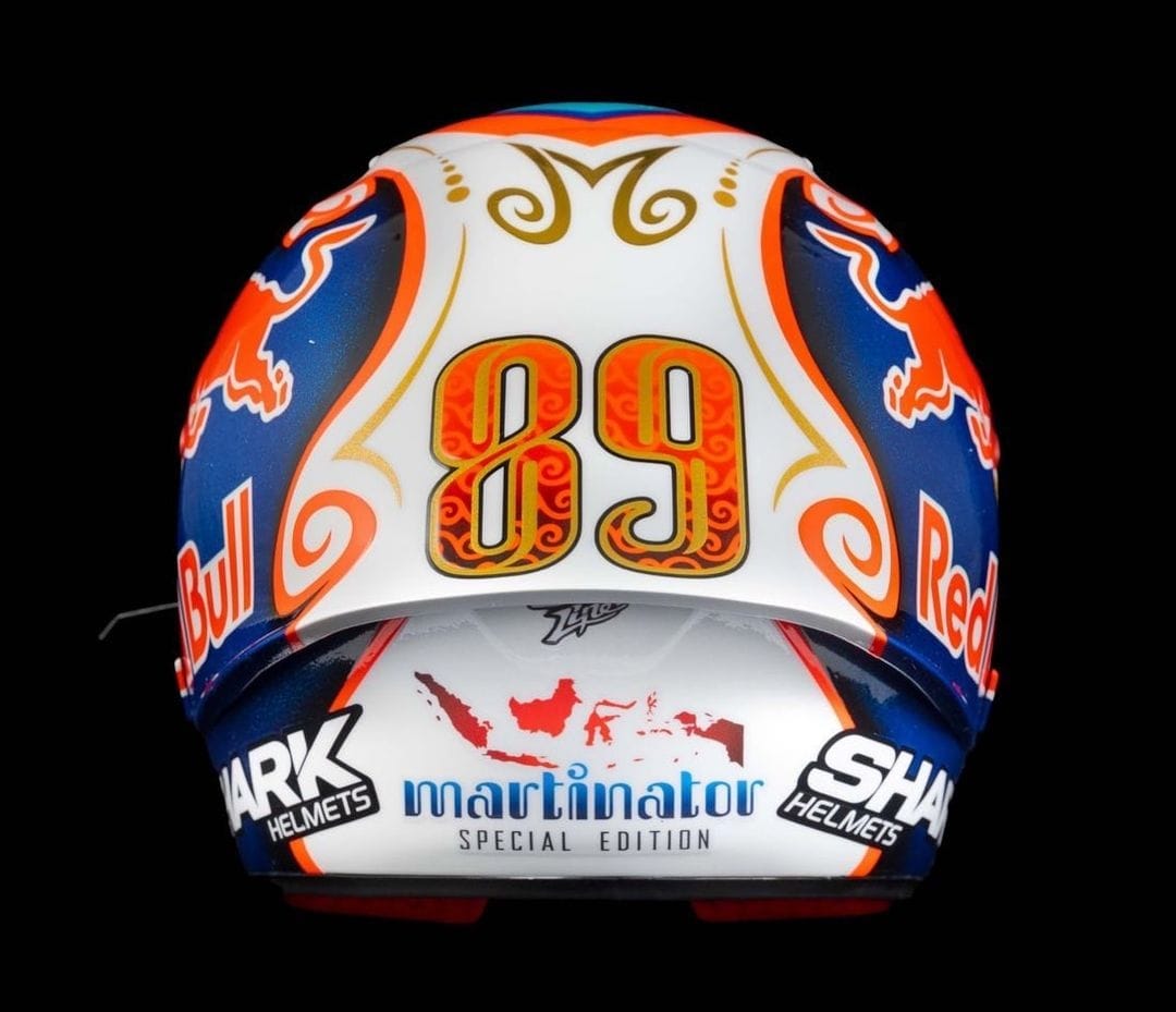 Sementara itu, untuk Jorge Martin juga tidak kalah spesial. Hanya saja, jika Zarco menggunakan motif batik Lombok, helm Jorge Martin menambahkan aksen batik Jawa, Menariknya, pada bagian belakang juga diberi gambar kepulauan Indonesia dan ada tulisan Martinator dengan aksen font Jawa banget. Istimewa pokoknya. | Foto : IG