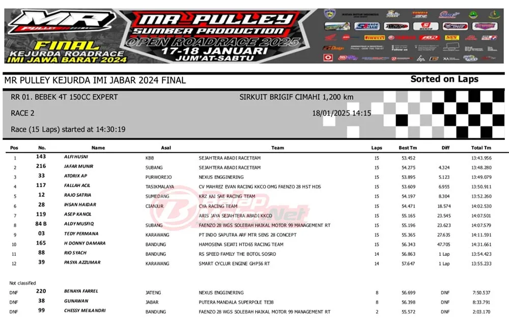 Alfi Husni nama lain dari Husni Zainul Fuadzy berhasil double winner pada dua race. Sementara itu, Jafar Munir mampu double runner up. Jadi dua rider dari tim asal Bandung ini sangat berkuasa.
