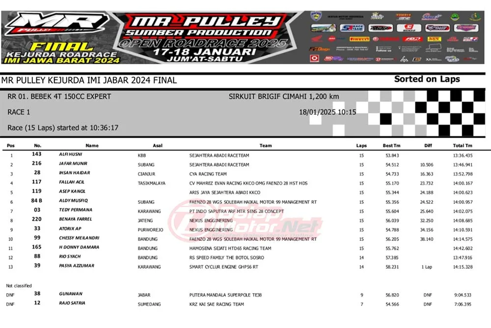 BalapMotor.Net – Dua rider dari pasukan Sejahtera Abadi Race Team yaitu Husni Zainul Fuadzy dan juga Jafar Munir kuasai dua race kelas MP1 Expert pada gelaran Mr Pulley Sumber Production Road Race Final Kejurda IMI Jabar.