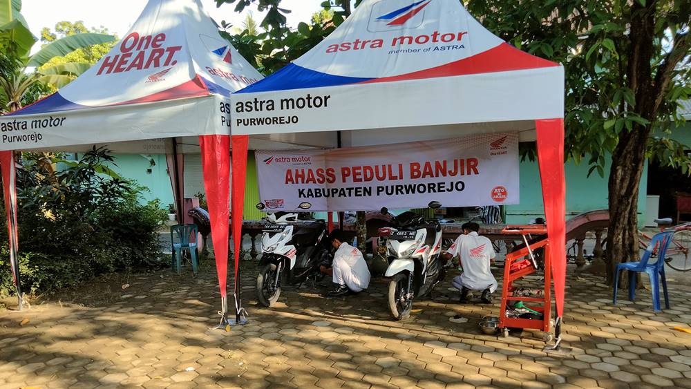 Dilaksanakan selama dua hari di kecamatan Bayan (2-3/6) tim Astra Motor menggelar servis gratis bagi sepeda motor Honda milik warga yang terdampak banjir. Tercatat dalam dua hari pelaksanaannya total puluhan unit sepeda motor telah merasakan manfaat program ini. Program Honda Berbagi dalam merespon banjir di Purworejo ini dilaksanakan sebagai upaya preventif terhadap kerusakan yang lebih parah pada sepeda motor paska banjir.