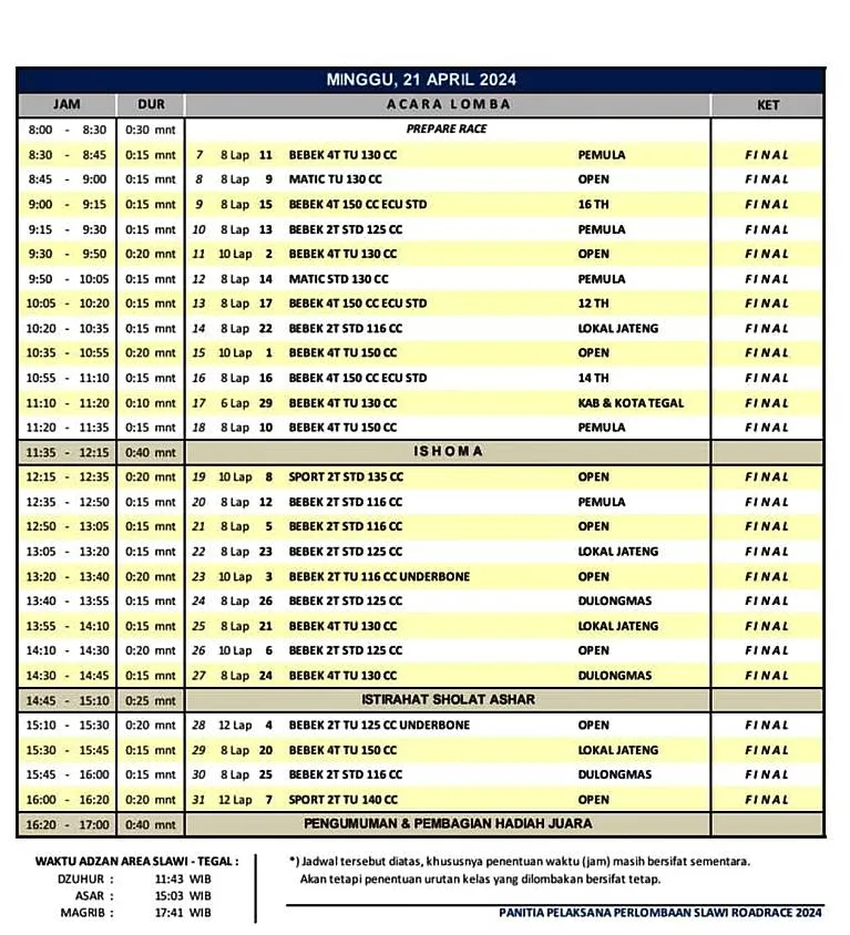 Nah, penyelenggara juga sudah merilis jadwal acaranya. Dimana hari Sabtu semua kelas akan menjalani sesi kualifikasi dilanjutkan race final untuk kelas lokal dan ex-rider. Sementara hari Minggu semua kelas akan final.