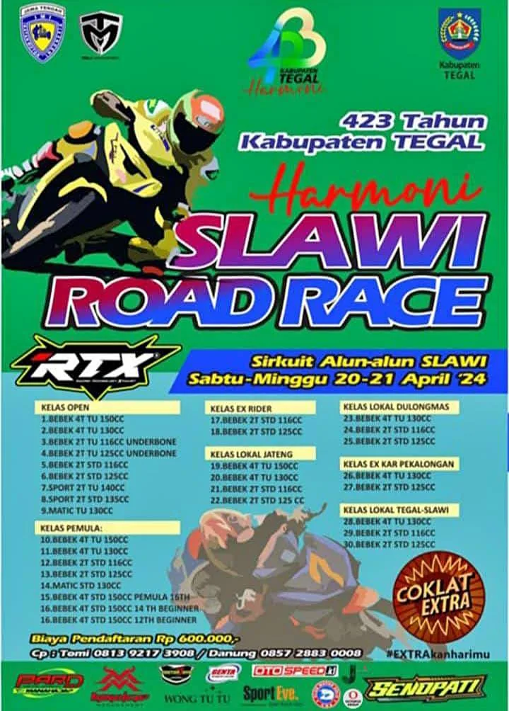 Event Slawi Road Race yang juga digelar dalam rangka 423 tahun Kab. Tegal ini akan digelar di sirkuit NP. Alun-alun Slawi pada 20-21 April 2024. Rencana 30 kelas yang terbagi menjadi 7 kategori siap dilombakan.