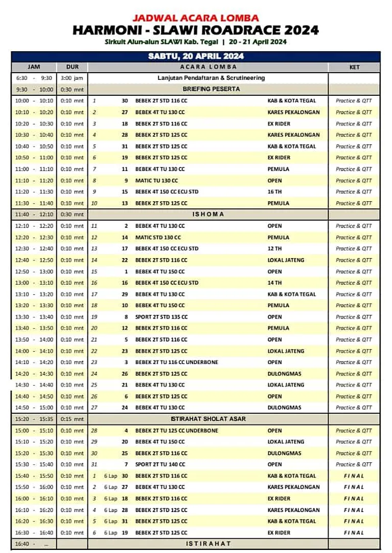 Nah, penyelenggara juga sudah merilis jadwal acaranya. Dimana hari Sabtu semua kelas akan menjalani sesi kualifikasi dilanjutkan race final untuk kelas lokal dan ex-rider. Sementara hari Minggu semua kelas akan final.