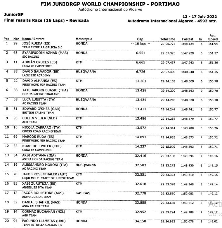 BalapMotor.Net – Fadillah Arbi Aditama, Pebalap Astra Honda Racing Team (AHRT) berhasil finis di posisi ke-13 dan mendapatkan 3 poin pada balapan seri kelima ajang FIM JuniorGP yang berlangsung di Autodromo do Algarve, Portugal (17/7). Pebalap satu-satunya dari Indonesia di ajang ini menunjukkan konsistensinya di tengah persaingan ketat yang dilakoninya sejak sesi kualifikasi.