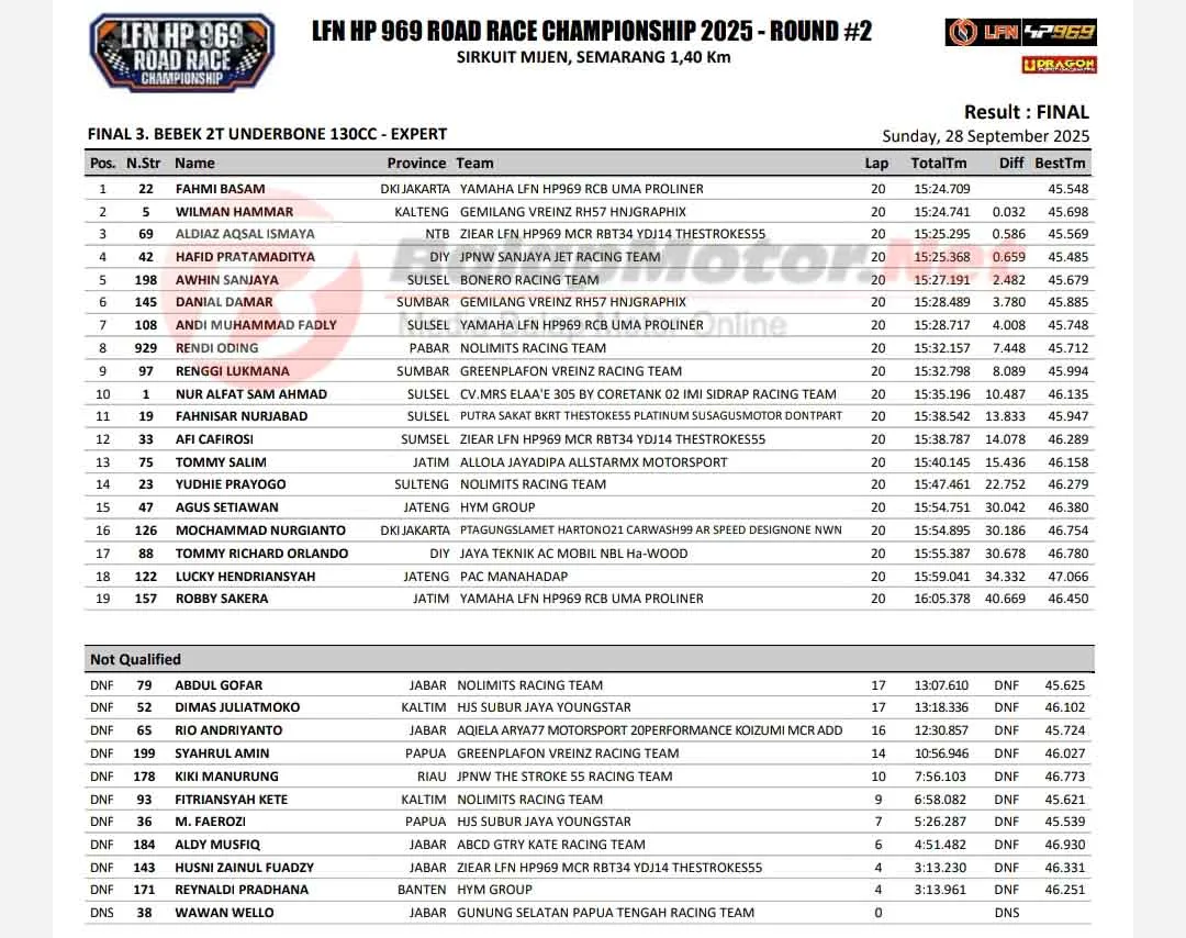 BalapMotor.Net – Fahmi Basam melanjutkan tradisi juara Underbone LFN HP969 Racing Team. Yup, motor racikan AB Bendol itu kembali menjadi yang terbaik di ajang bergengsi LFN HP969 Road Race Championship.