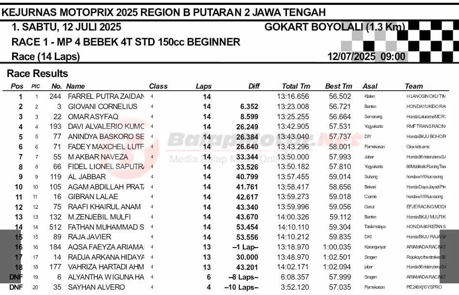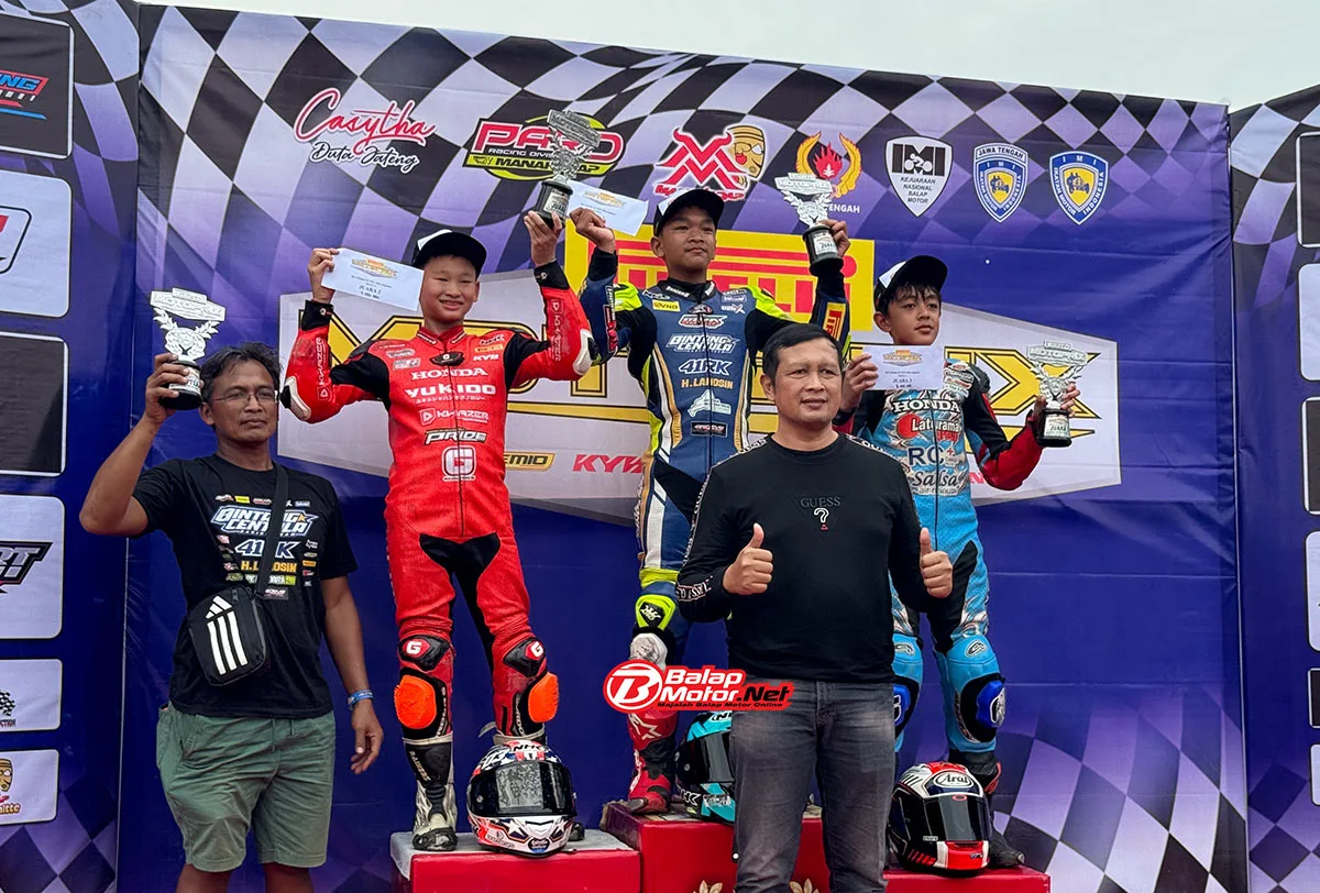 BalapMotor.Net – Pembalap belia yang membela pasukan Haji Lanosin OKU Timur Bintang Centula yaitu Farrel Putra Zaidane berhasil menjadi yang terbaik pada pertempuran race 1 kelas Bebek 4 Tak STD 150cc Beginner ronde kedua Kejurnas Motoprix Region B Jawa 2025.