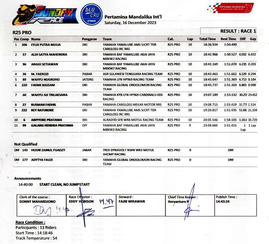 BalapMotor.Net – Felix Putra Mulya tampil begitu menawan pada jalannya Race 1 kelas R25 Pro Final Yamaha Sunday Race (YSR) 2023 di sirkuit Mandalika, Lombok.
