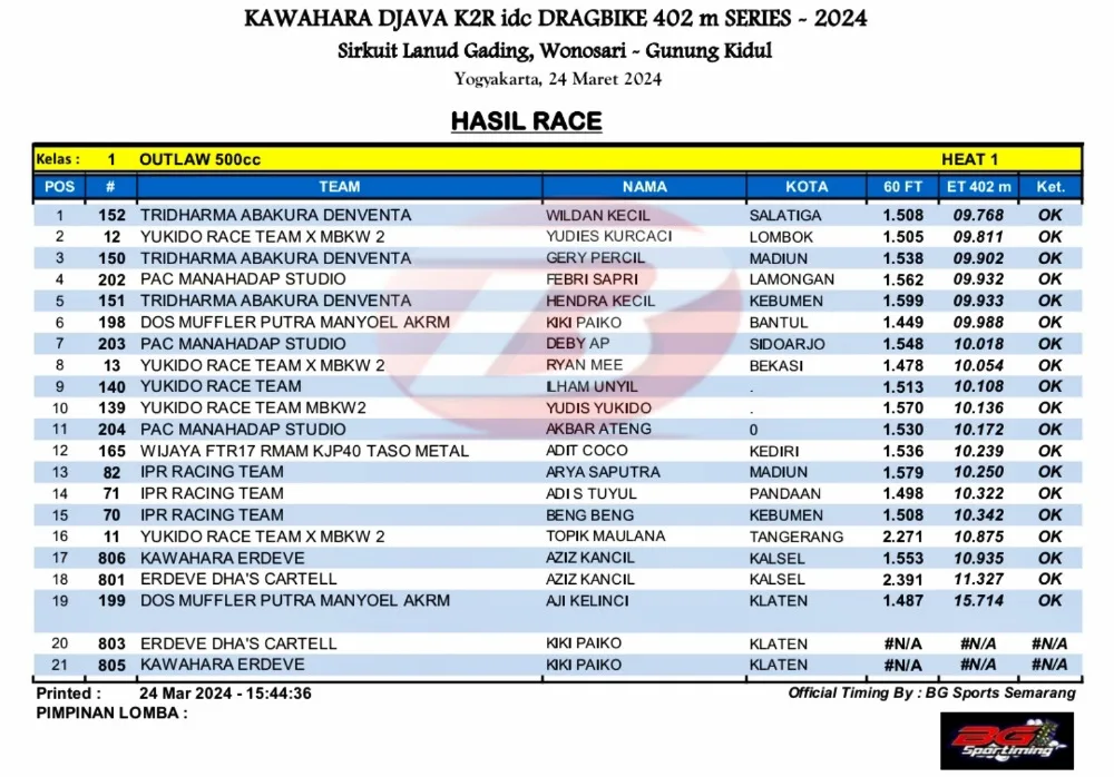 Adalah OUTLAW 500 dimana kelas ini dibebaskan untuk aturan mainnya. Khususnya bahan bakar yang mau pakai apa aja dipersilahkan. Nah, yang terbaik di Heat 1 adalah Wildan Kecil.