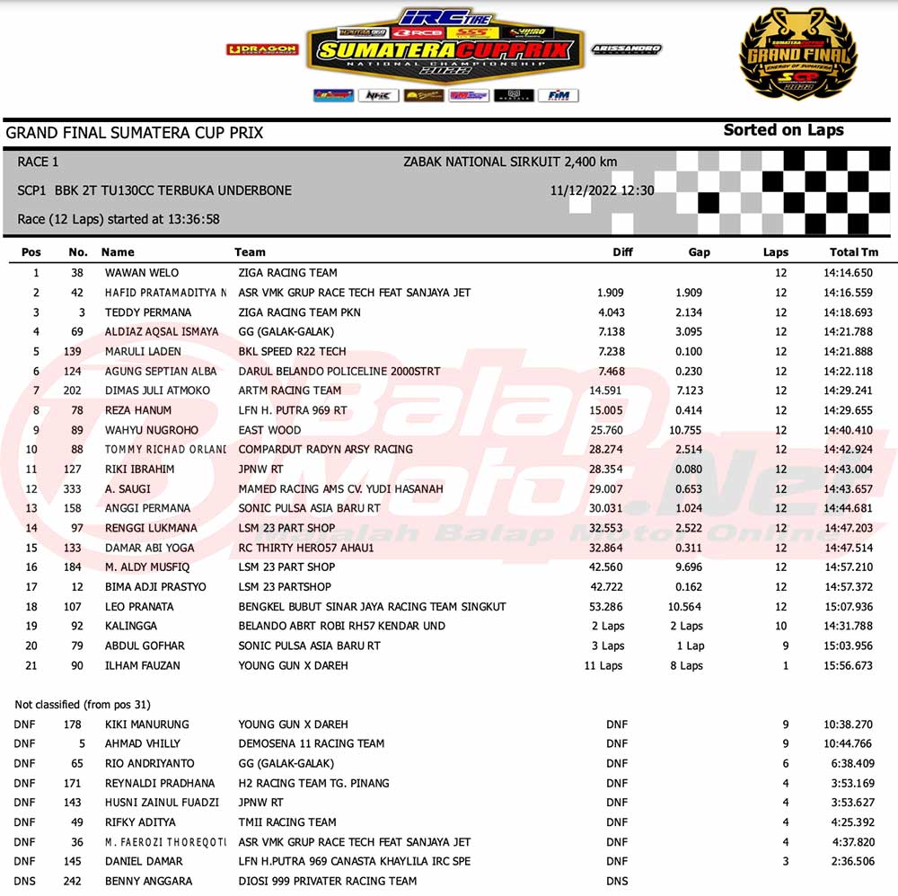 BalapMotor.Net – Pertarungan panas tersaji dalam race 1 kelas utama SCP1 yaitu kelas Underbone 2 Tak 130cc di Final Sumatera Cup Prix (SCP) 2022.