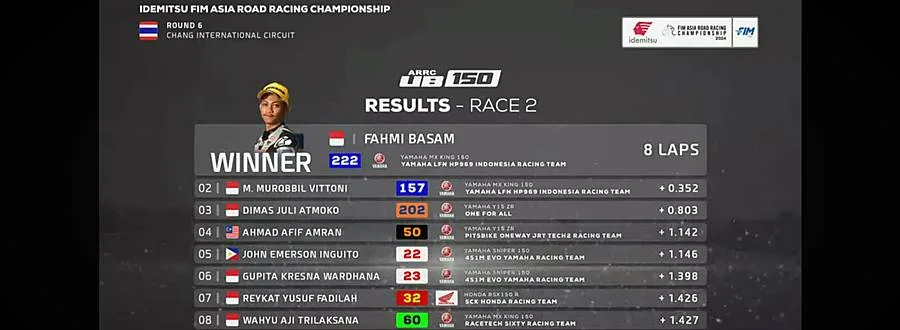 Fahmi Basam sukses finis di posisi pertama sekaligus memastikan dirinya sebagai raja Underbone. Sah, juara Asia tahun 2024 milik pembalap Yamaha LFN HP969 Indonesia Racing Team.