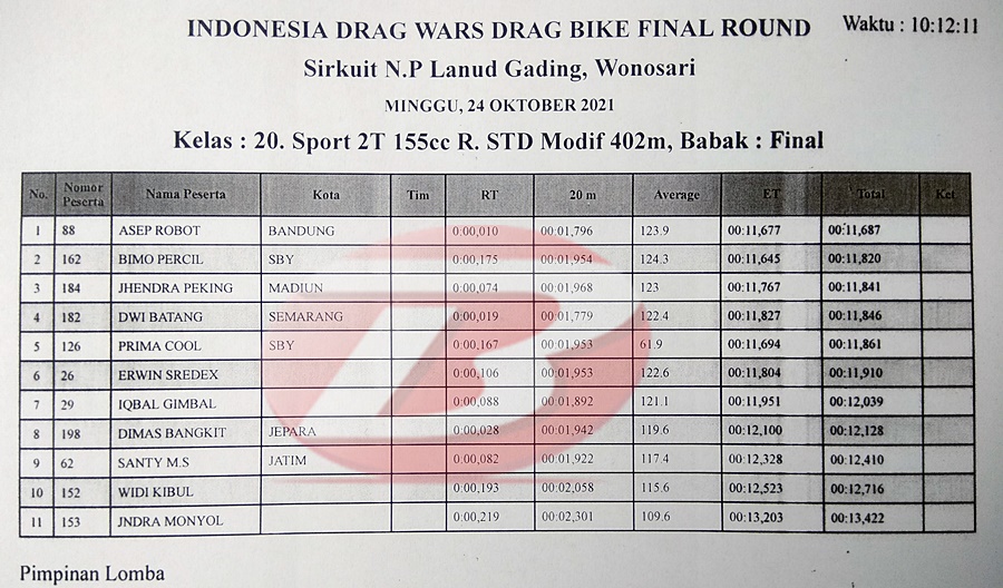 BalapMotor.Net – Asep Robot asal Bandung sukses menjadi jawara Sport 2T STD 155cc (402m) Kejuaraan balap lurus Indonesia Drag Wars (IDW) babak final yang berlangsung di sirkuit Lanud Gading, Wonosari, Yogyakarta (24/10).
