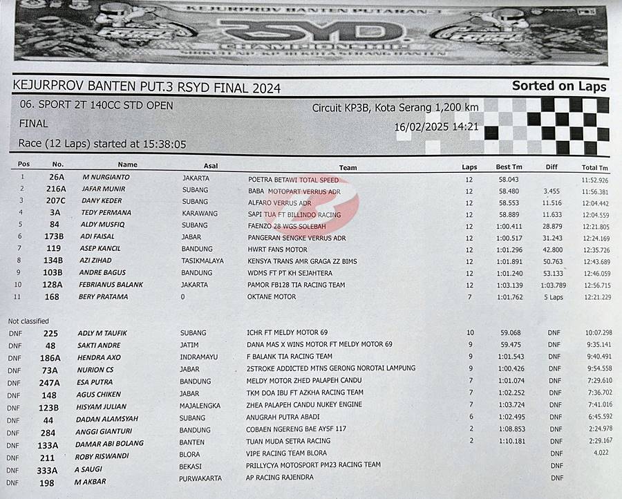 BalapMotor.Net – Kelas paling bergengsi di final RSYD Championship Kejurprov Banten, RX-King Chamber 140cc harus tersaji dalam kondisi lintasan basah. Hal ini pun membuat pertarungan semakin mendebarkan.