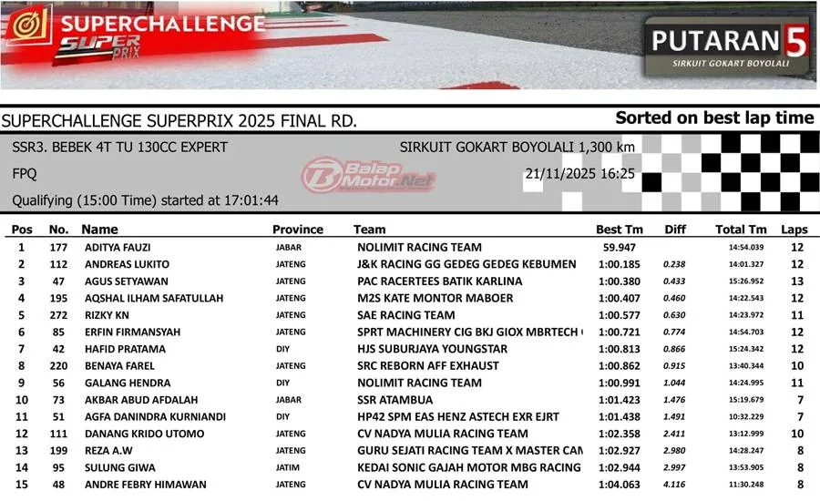 BalapMotor.Net – Aditya Fauzi keluar sebagai pembalap tercepat pada sesi kualifikasi kategori Bebek 4T TU 130cc Expert di putaran final Superchallenge Superprix yang digelar di Sirkuit Boyolali, Jawa Tengah, Sabtu 21 November 2025.