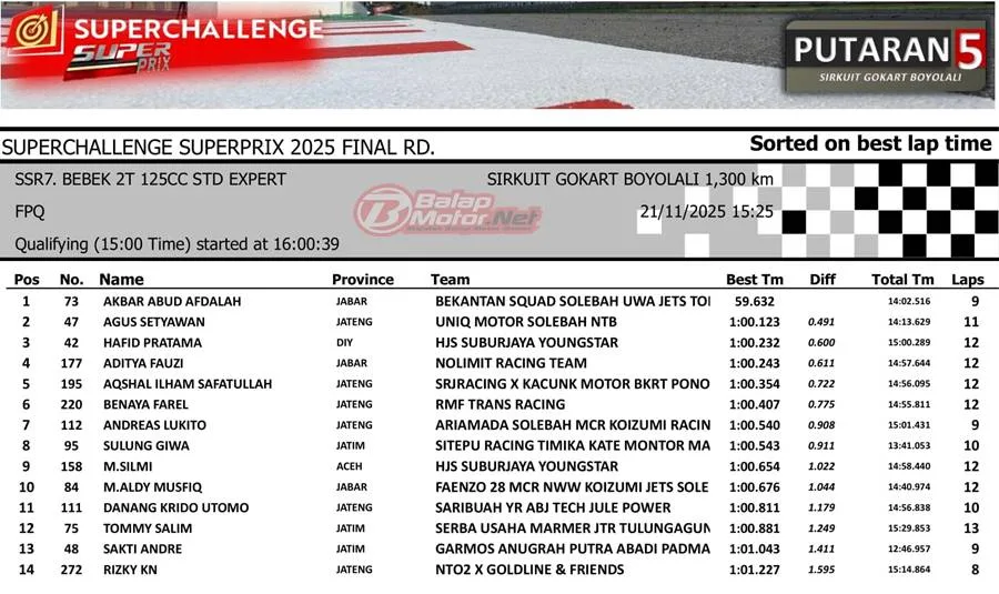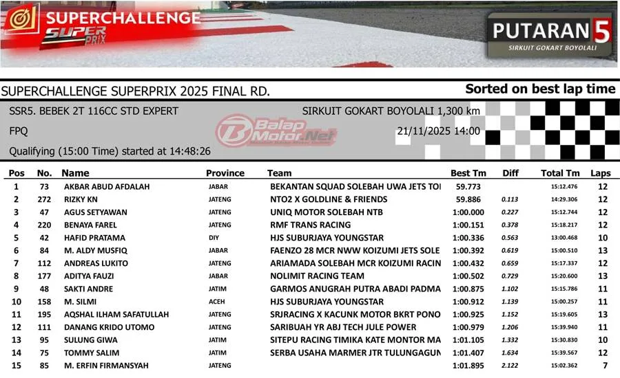 BalapMotor.Net – Akbar Abud Afdalah tampil begitu dominan pada sesi kualifikasi kategori Bebek 2T Standar di putaran final Superchallenge Superprix yang digelar di Sirkuit Boyolali, Jawa Tengah, Sabtu 21 November 2025.
