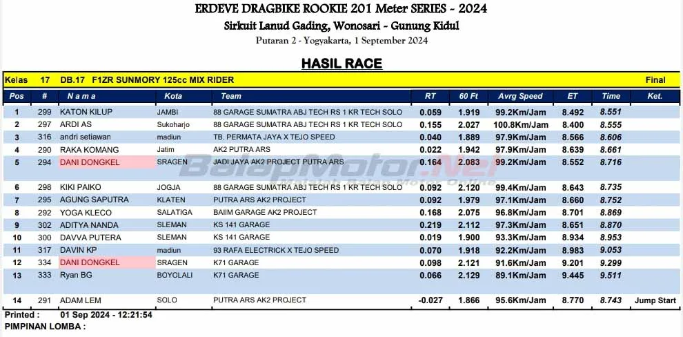 BalapMotor.Net – Satu spek FizR Sunmori asal Sumatera bikin kejutan di Erdeve Drag Bike Rookie putaran kedua yang berlangsung di sirkuit NP. Lanud Gading, Wonosari, Yogyakarta (1 September 2024).