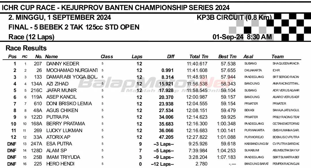 Nah, di kelas Bebek Goreng Open ini Danny Keder sukses jadi yang terbaik. Pembalap dari tim PT. Rafa Group Mahajaya Bengkel Kampoeng itu berhasil mengalahkan 16 pembalap lainnya. Mantap!