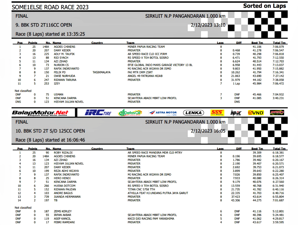 Pacuan garapan Lehan yang diturunkan pada kelas bebek 2T STD 116cc dan 125cc sukses memberikan hasil yang cukup maksimal. Yup, Agus Chikens selaku pilot mampu meraih gelar juara dan runner-up.