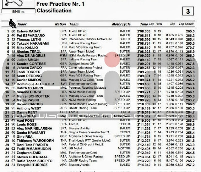 Balap-Motor.com Latihan bebas pertama kelas Moto2 GP Sepang baru saja berlangsung tadi pagi 11/10 di sirkuit Sepang Malaysia. Pasti dah ga sabar nih nunggu hasilnya pembalap kita di sirkuit yang paling dekat di seri MotoGP tahun ini, juga tentu saja para pembalap Asean yang kali ini ada 7 pembalap yang turun dikelas Moto2. Esteve Rabat pembalap Spanyol kali ini menjadi yang tercepat dengan torehan waktu lihat di bawah saja mengungguli rekan setimnya Pol Espargaro yang sedang berebut titel juara dunia Moto2 tahun ini melawan Scott Redding yang hanya mampu bertengger di posisi ke-12.
