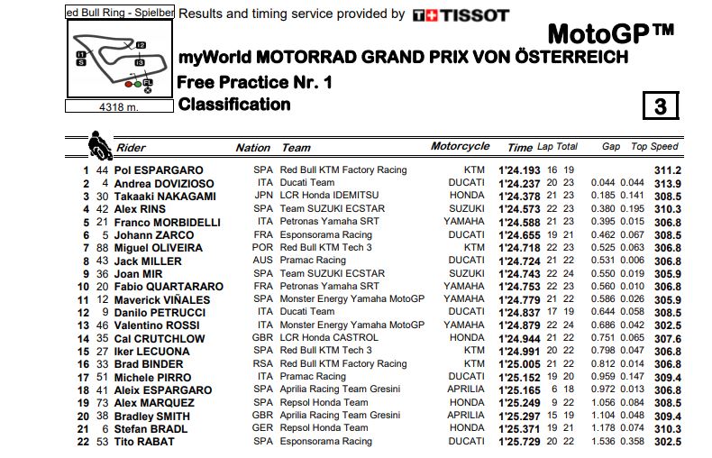 Sementara itu pembalap yang menggunakan Yamaha M1 terlempar dari 10 besar di sesi FP1 ini. Hanya nama Franco Morbidelli yang sukses menempus posisi ke 5. Berikut hasil FP1 MotoGP Austria 2020 selengkapnya.