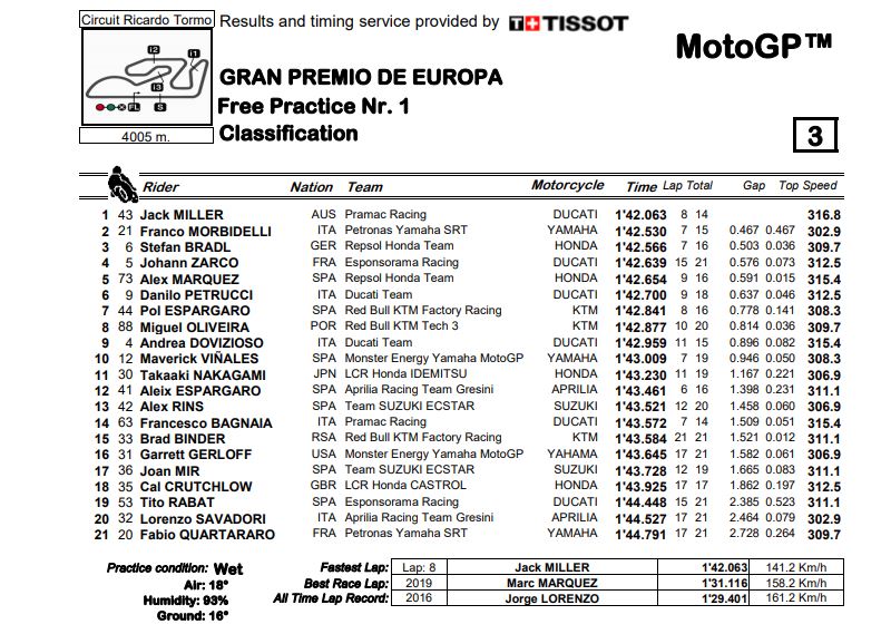 BalapMotor.Net – Gelaran grand prix seri ke 13 yang bertajuk MotoGP Eropa 2020 telah melangsungkan sesi FP1. Pada sesi FP1 ini, Jack Miller langsung melesat di track basah sirkuit Valencia pada jumat (06/11).