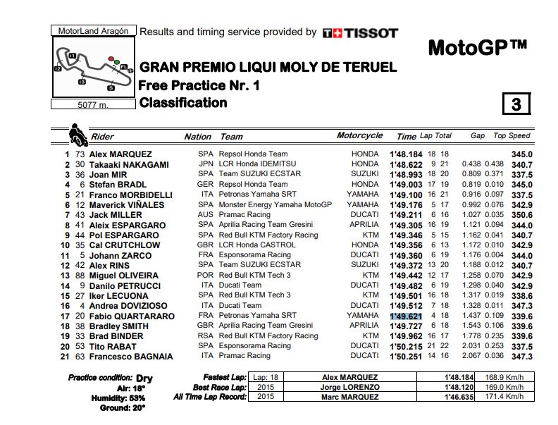 Berikut hasil selengkapnya dari sesi FP1 MotoGP Teruel 2020.