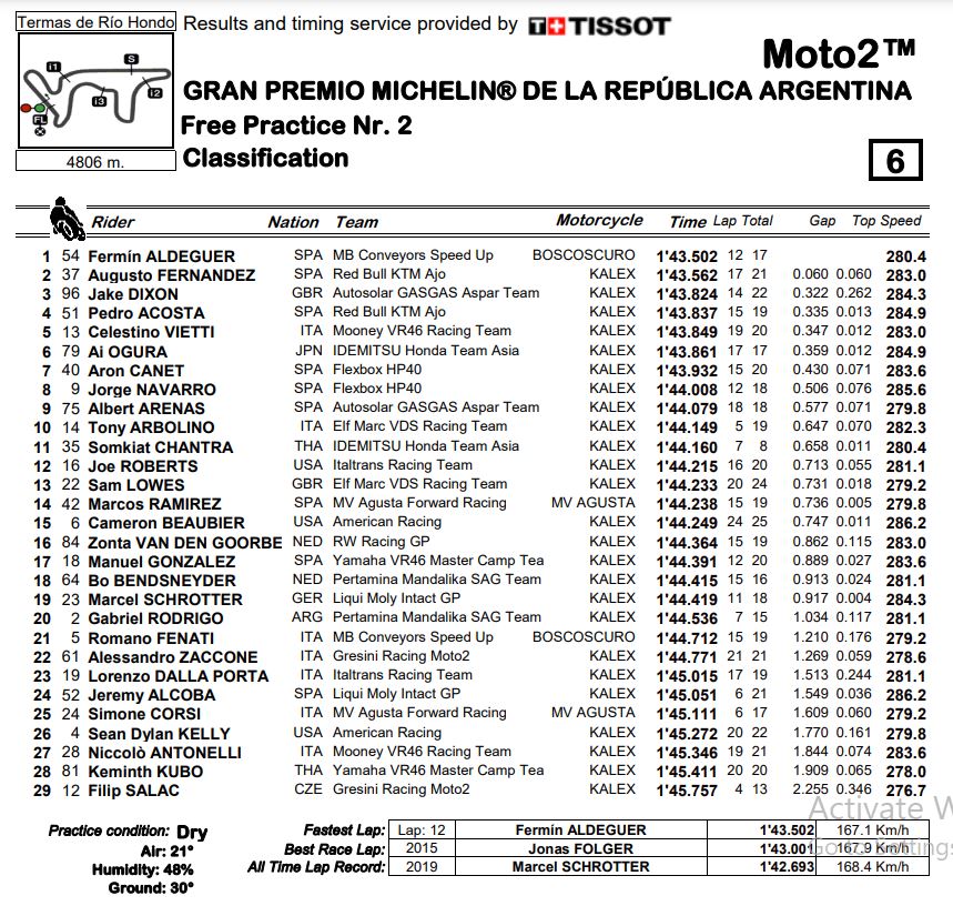 Pembalap yang membela tim MB Conveyor Speed Up ini mencetak best time 1 menit 43.502 detik pada sesi FP2. Meskipun tidak lebih cepat dibandingkan pada sesi FP1, tetapi Fermin masih menjadi yang terbaik dan posisi kedua kembali diisi oleh Augusto Fernandez (Red Bull KTM Ajo).