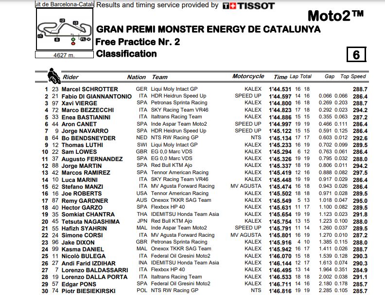 Sedangkan adik dari Valentino Rossi yaitu Luca Marini di sesi FP2 malah tercecer di urutan ke 14. Catatan waktu dari Luca Marini masih lebih baik di sesi FP1 dengan 1.44.322s ketimbang di sesi FP2 yang hanya di angka 1’45.448s.