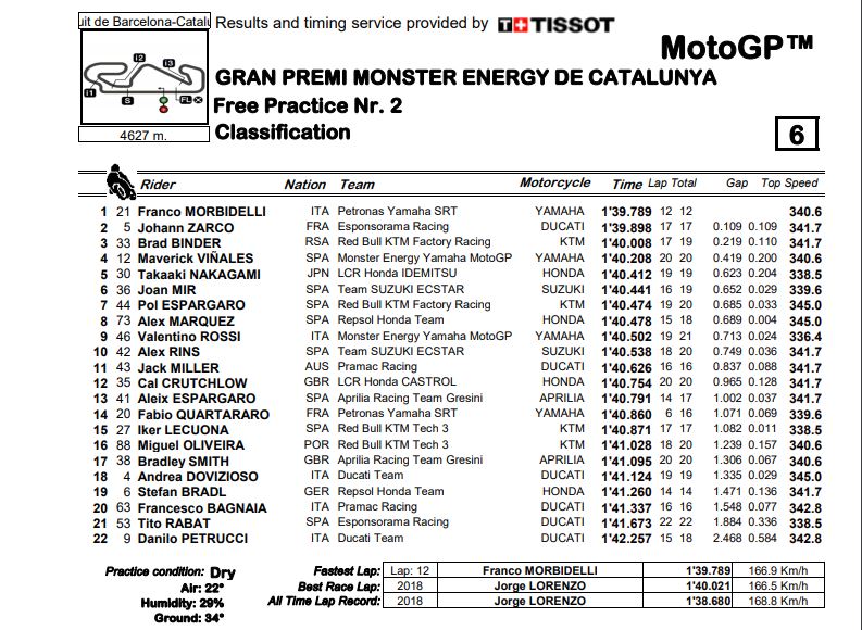Morbidelli yang merupakan anak didik dari valentino Rossi ini berhasil melesat dengan torehan waktu 1.39.789s, Menariknya hanya ada 2 pembalap yang berada di angka 1 menit 39 detik yaitu Morbidelli dan Johann Zarco.