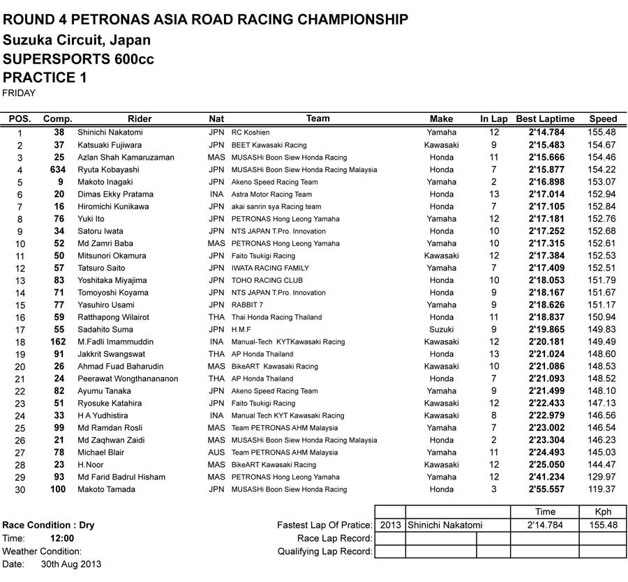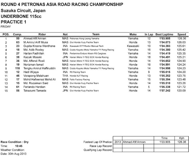 Menginjak gelaran balap motor yang paling mantap di asia yaitu Asia Road Racing Championship alias ARRC yang kali ini sudah masuk di seri ke-4. Setelah Malaysia, Indonesia, dan India, kali ini ARRC akan singgah di negeri sakura yang merupakan negara pusat segala bidang otomotif asia khususnya roda dua. Siang tadi 30 Agustus 2013 para pembalap all class sudah mengikuti jalanya latihan bebas atau boso londone Free Practice di sirkuit yang melegenda di Jepang yaitu sirkuit Suzuka..
