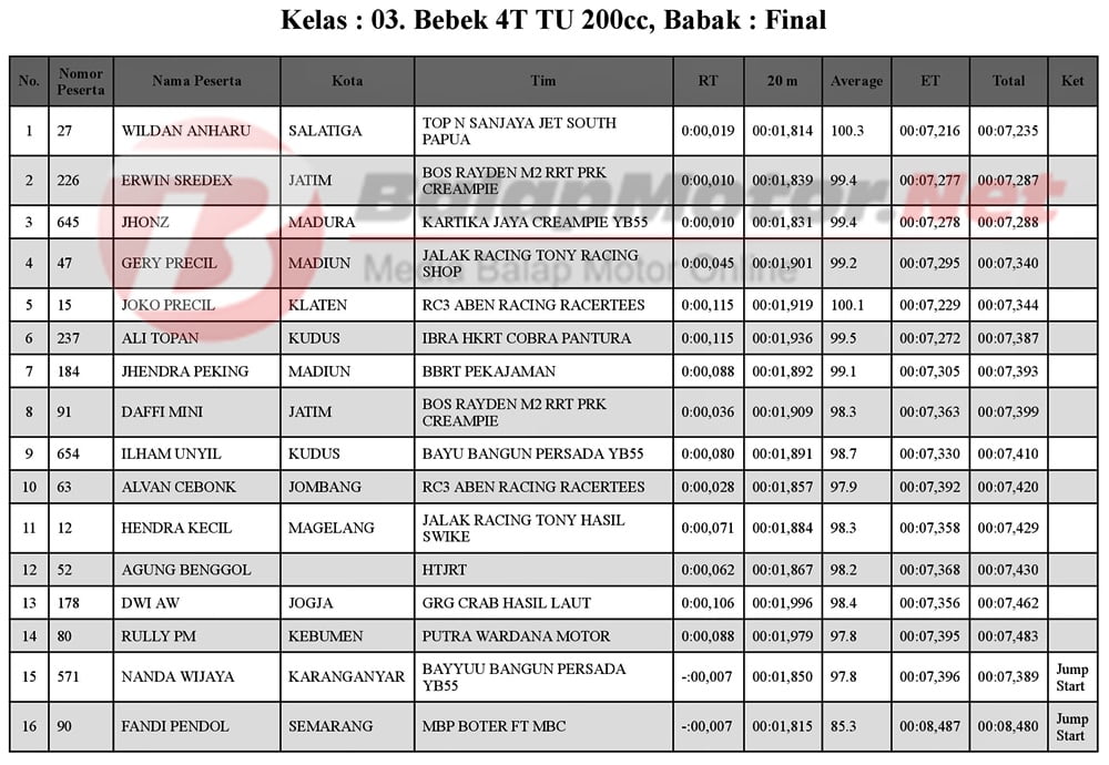 Adalah Wildan Kecil. Joki asal Salatiga ini merupakan pemilik FU 200 yang dikawal langsung oleh tunner Cak Moed. Jadi, Wildan pakai motor pribadi untuk menambah kelengkapan motor dari tim TOP-N Sanjaya Jet South Papua.
