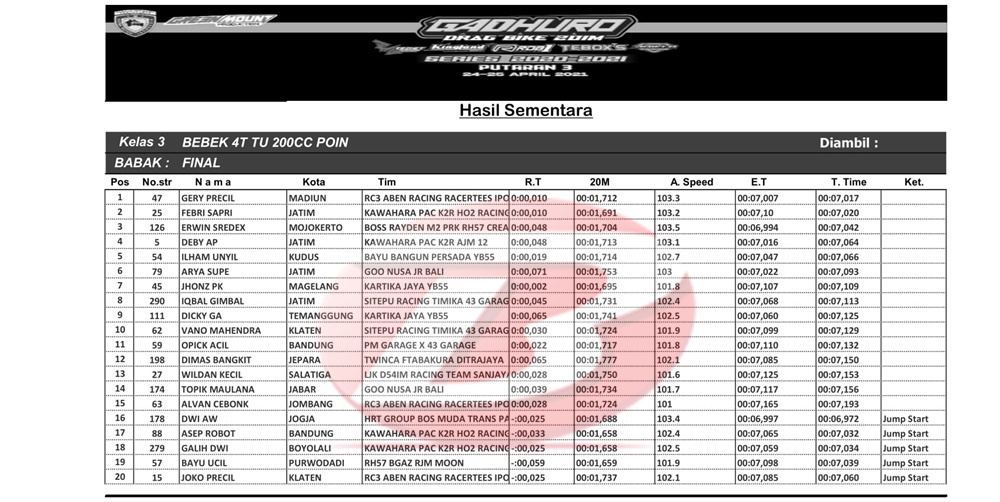 “Coba tampil all out saja mas. Alhamdulillah bisa lebih baik dari kemarin,” singkat Gerry yang torehkan waktu terbik 7,017 detik.