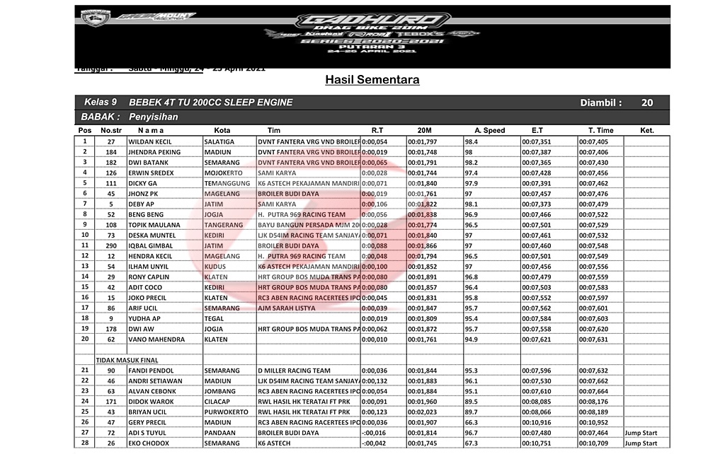 Dalam kelas bebek 200 sleep engine ini diserbu 28 starter. 20 pembalap berhak mengikuti babak final hari Minggu besok, sementara 8 pembalap harus keluar dari persaingan, diantaranya Eko Chodox, Alvan Cebonk, Gerry Percil dan nama besar lainnya.