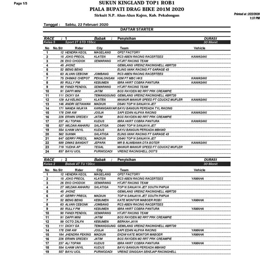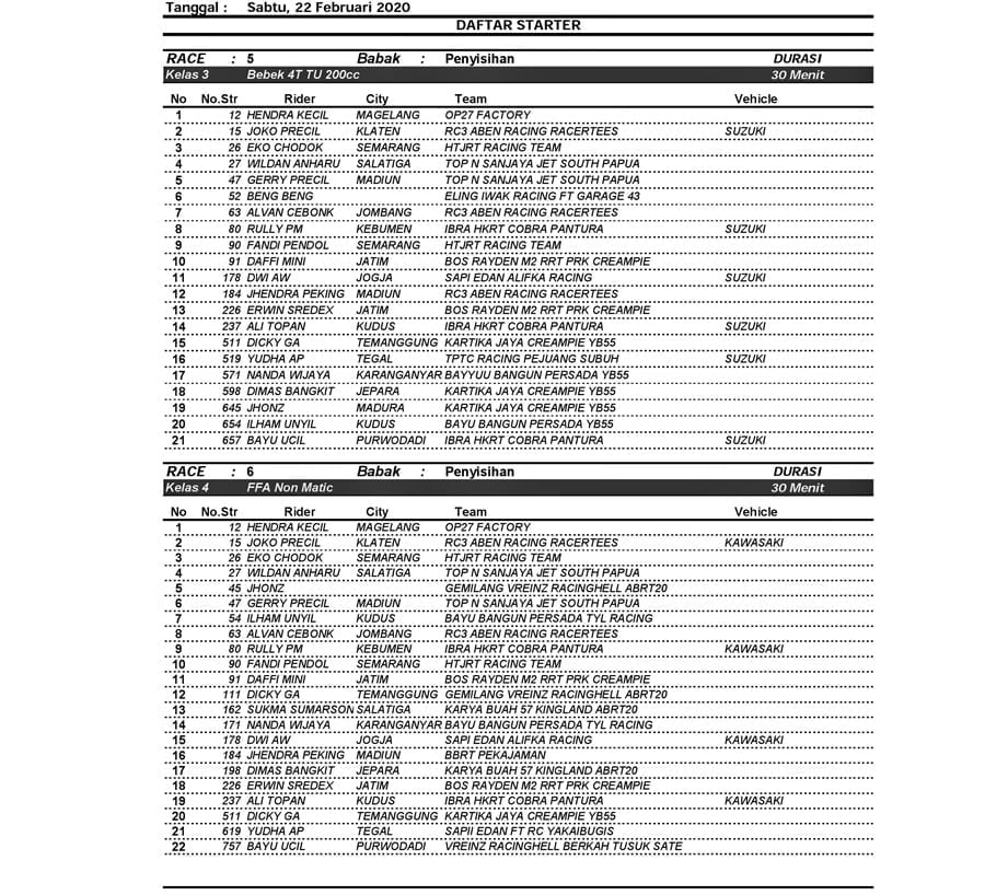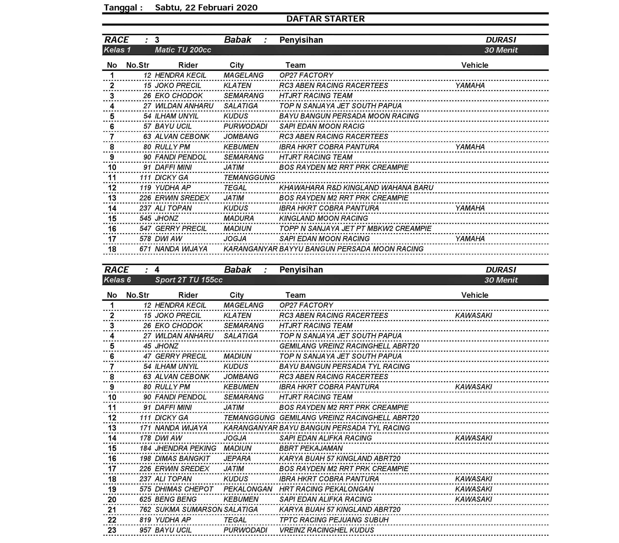 Seperti Eko Chodox, Alvan Cebonk, Jendra Peking, Dafi Mini dan lainnya. Mereka pun hadir dengan beberapa tim dan bendera kebesaran. Dari pantauan daftar starter sementara, setiap kelas hampir rata di atas 20 starter semua.