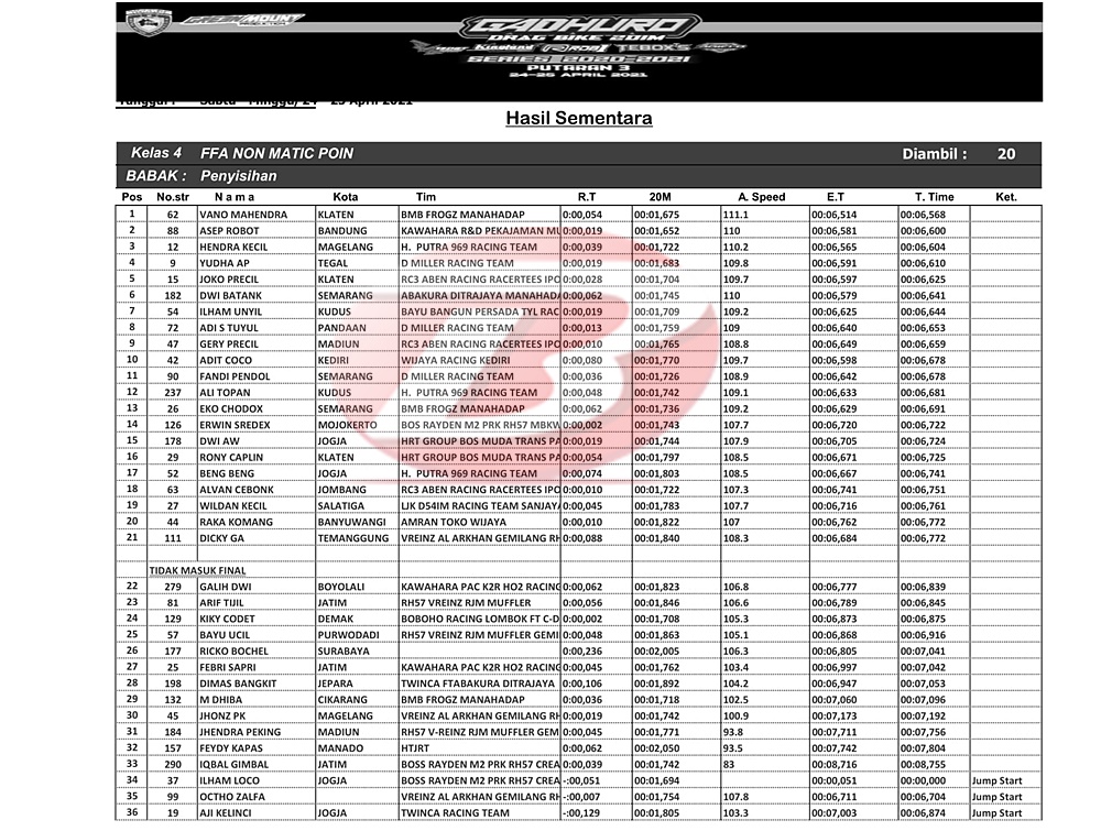 Dan menariknya catatan waktu 6,8 detik tidak berhak mengikuti final di hari Minggu besok. Posisi tercepat di penyisihan sore hari tadi dicatat oleh pembalap pemula Vano Mahendra. Dengan Ninja BMB Frogz Manahadap, Vano hampir saja pecahkan rekor best time FFA 201m.