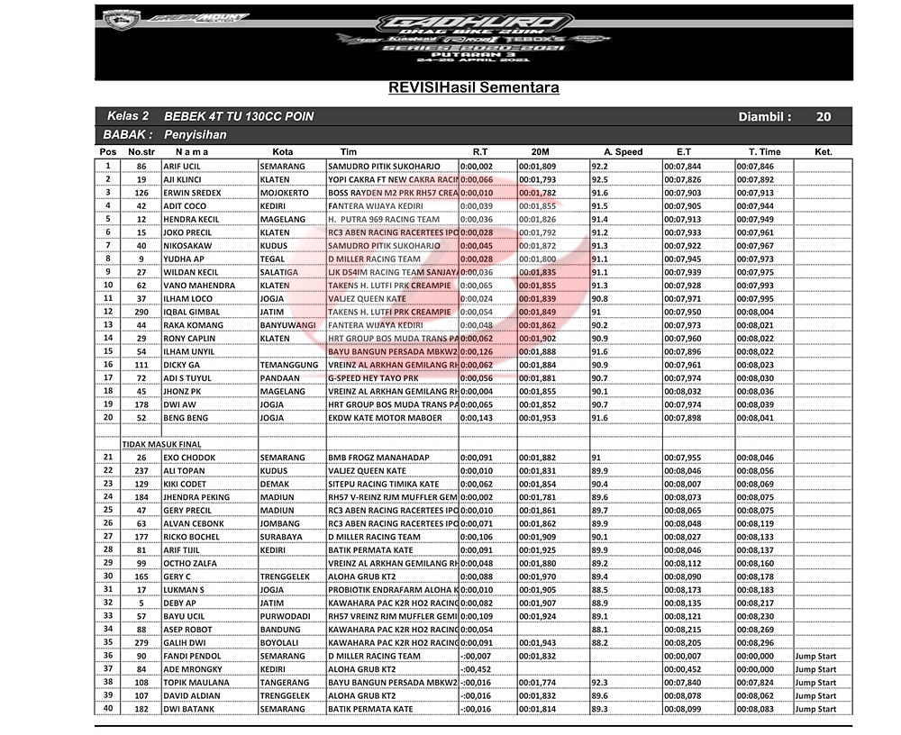 Ucil unggul tipis dari Aji Kelinci di posisi kedua yang sama-sama mencatat 7,8 detik. Sementara posisi ketiga sudah 7,9 detik dan seterusnya bisa cek hasil di bawah tulisan ini.