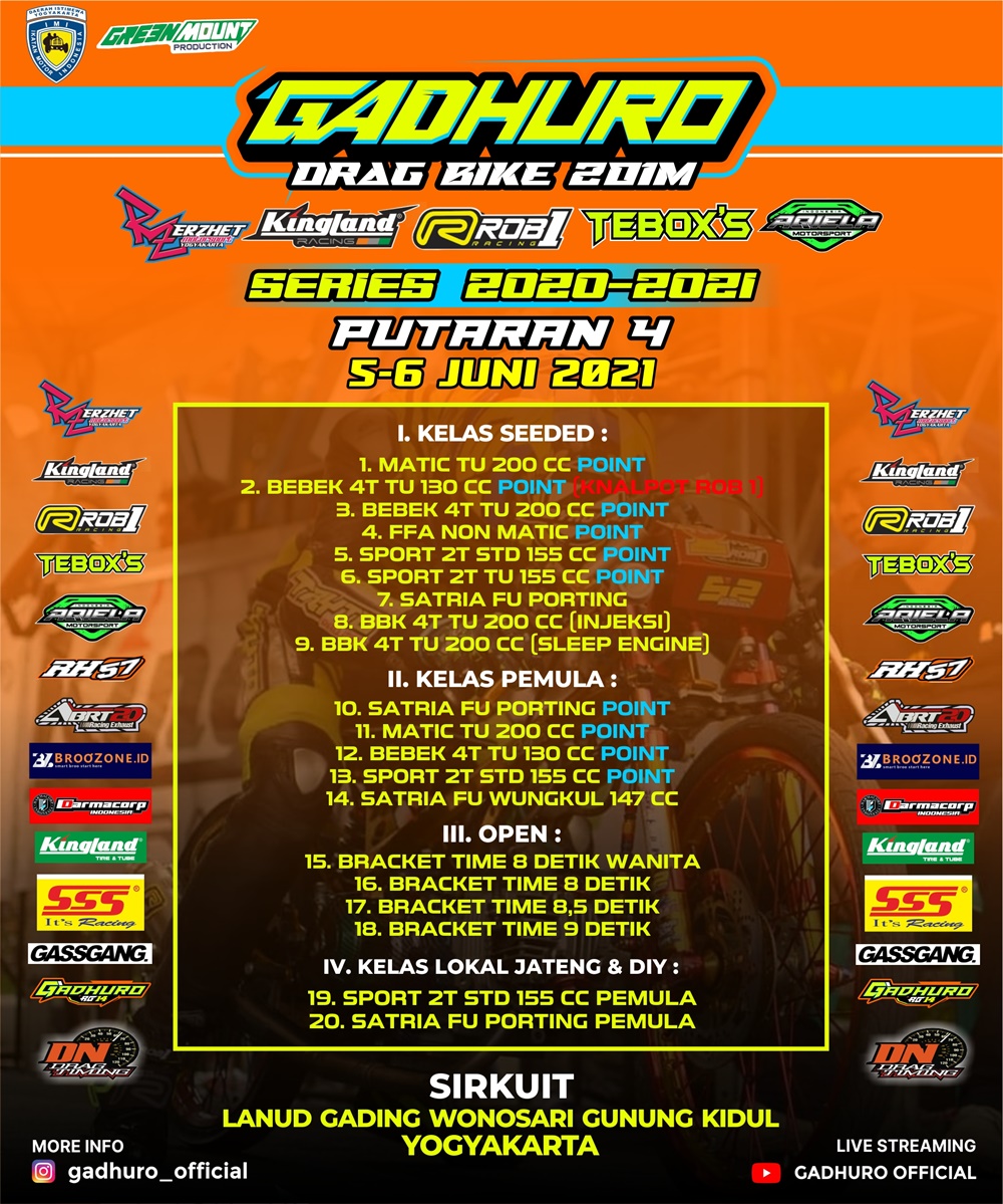 BalapMotor.Net – Gadhuro Sport Club selaku promotor penyelenggara kejuaraan balap lurus 201m bertajuk Gadhuro Drag Bike Series telah merilis putaran ke-4 nya.